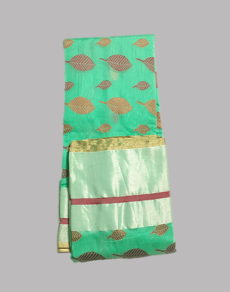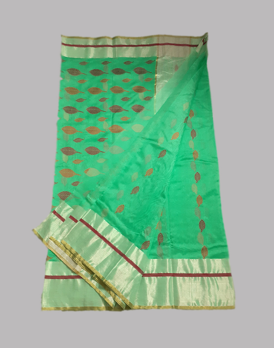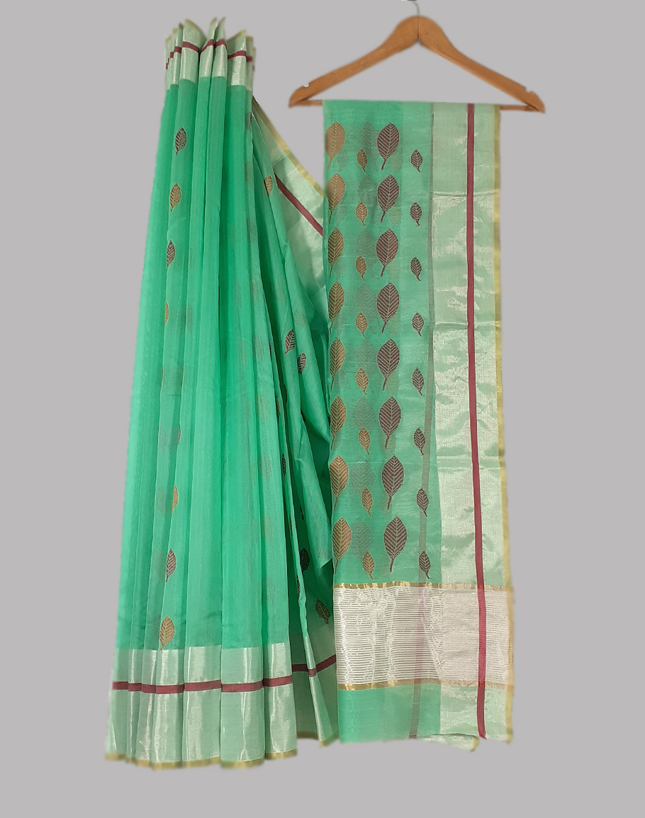 Enhance your look with this beautiful cotton silk chanderi saree which comes with leaf motifs and a zari border. This saree comes with an unstitched blouse.