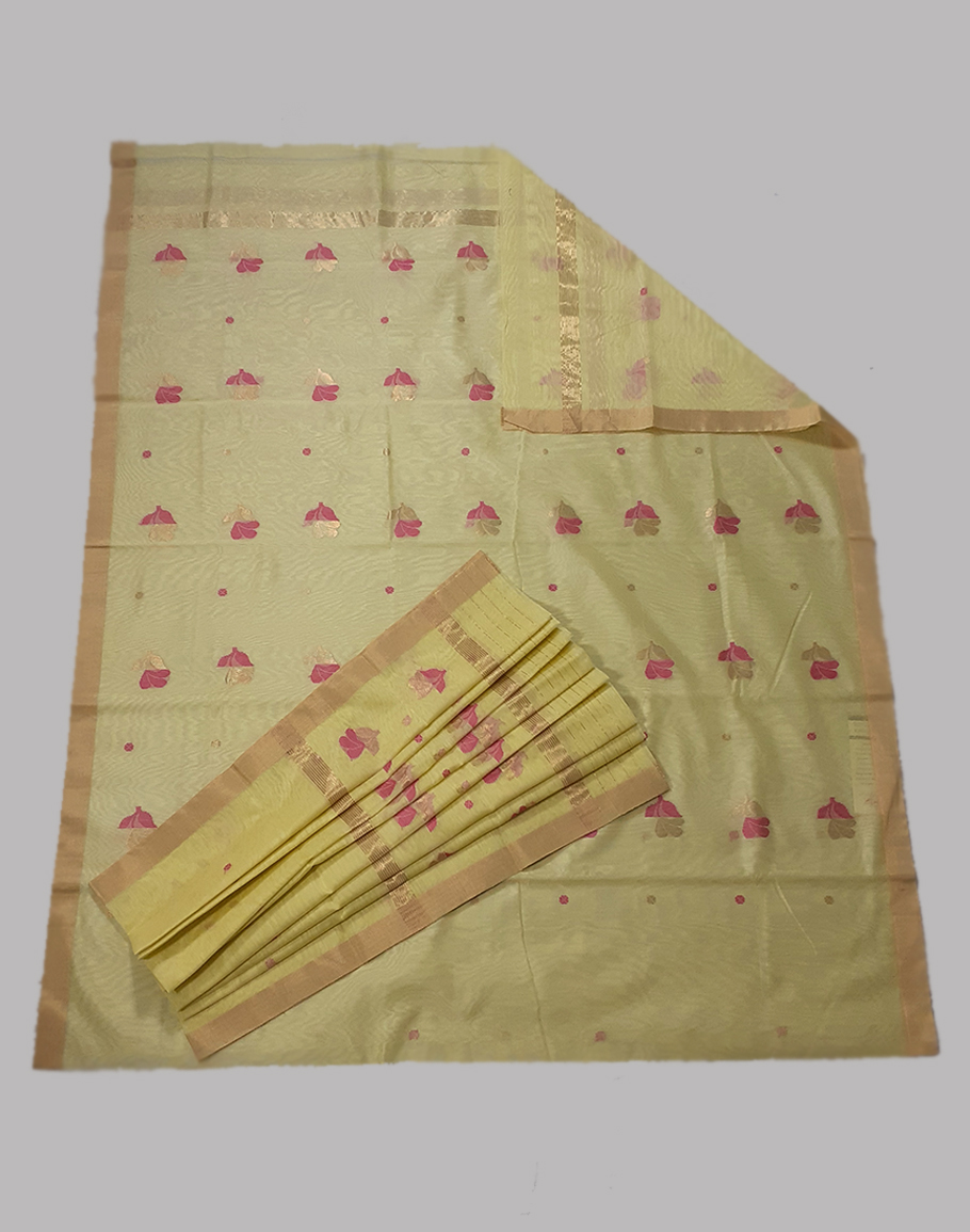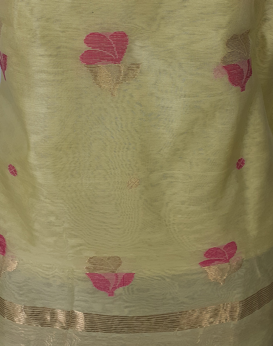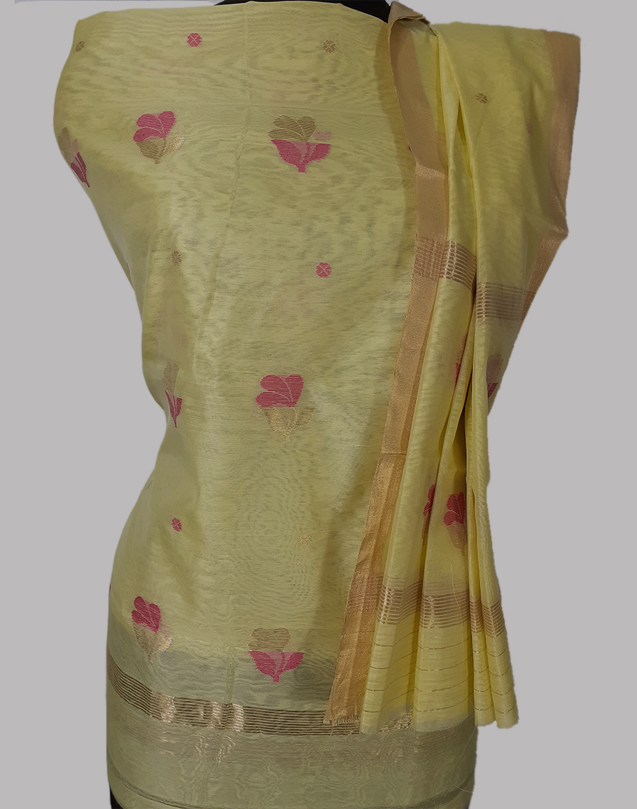 Chanderi silk cotton two piece bright pink suit with leaf motifs and zari border