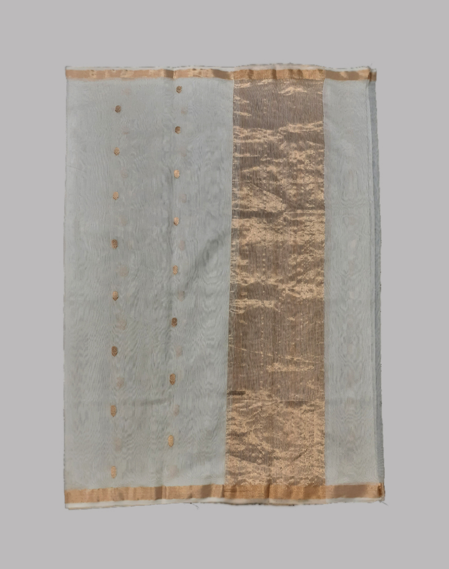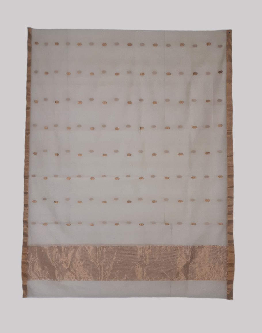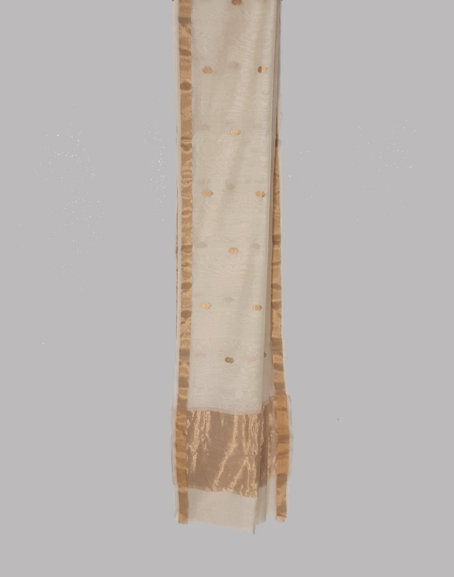 Chanderi silk cotton off white dupatta with coin motifs all over the body, zari strips and border with tassels