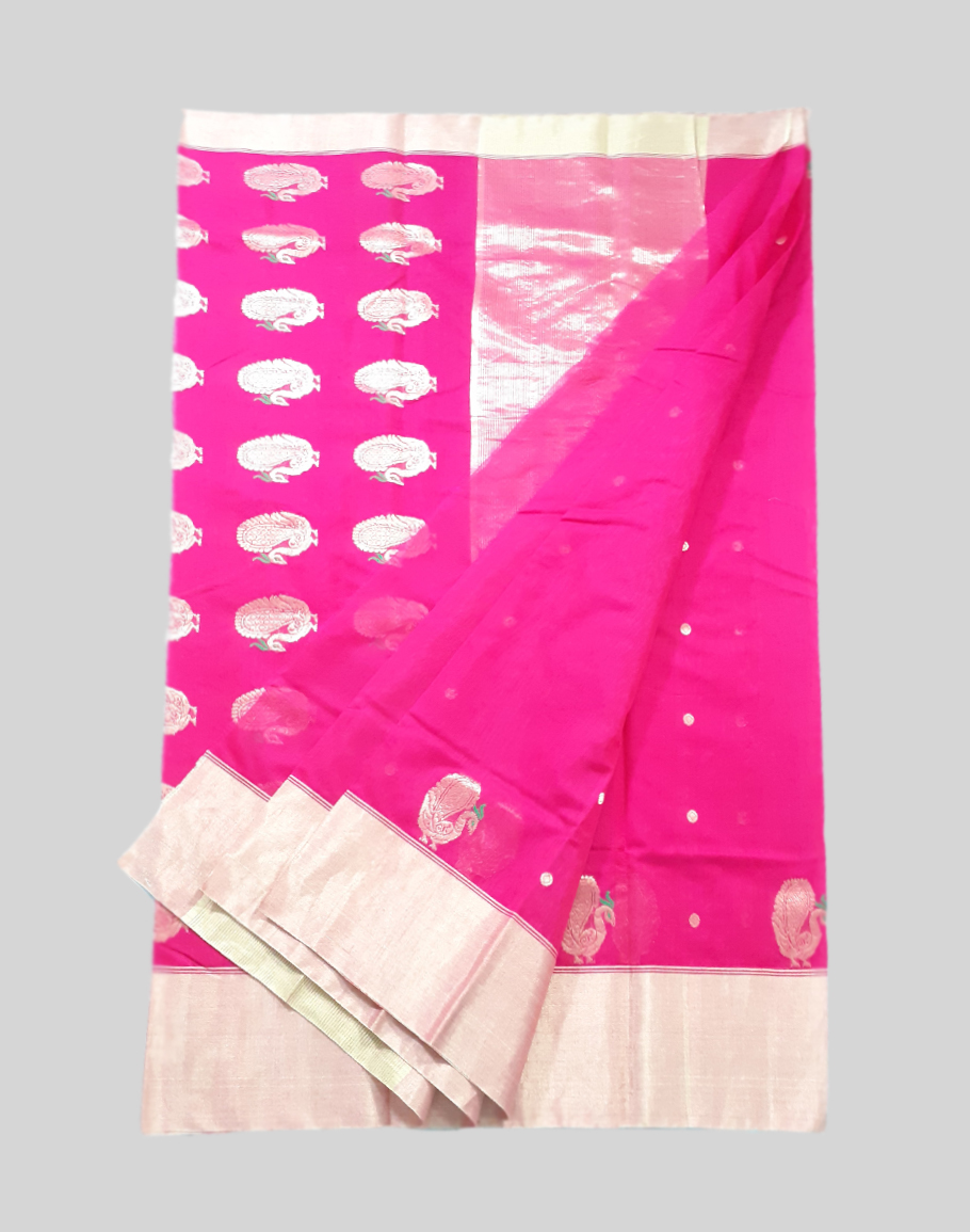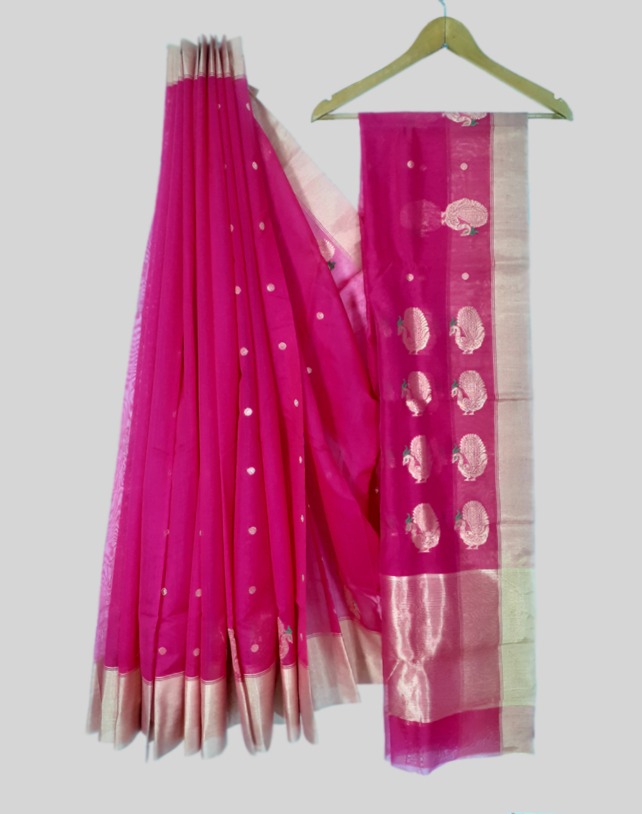 A mesmerizing cotton silk chanderi saree with traditional peacock motifs on pallu, coin motifs on its body and a golden zari border. This saree comes with an unstitched blouse.