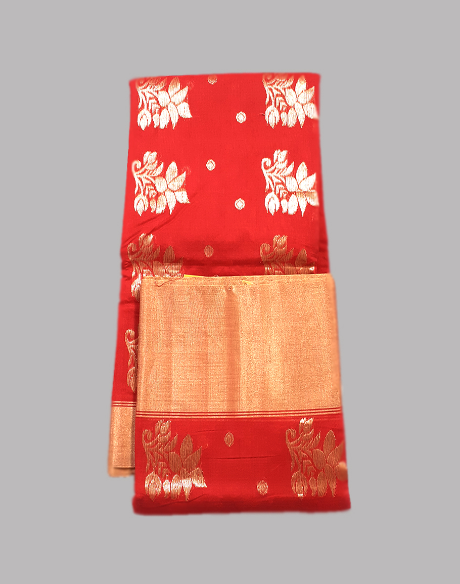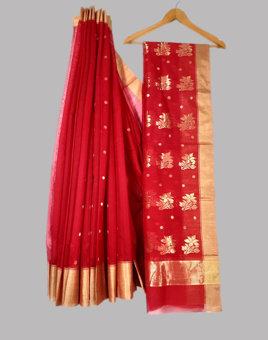 A radiant red cotton silk chanderi saree with traditional golden flower motifs on pallu and zari boota motifs on all over its body. This saree comes with an unstitched blouse.
